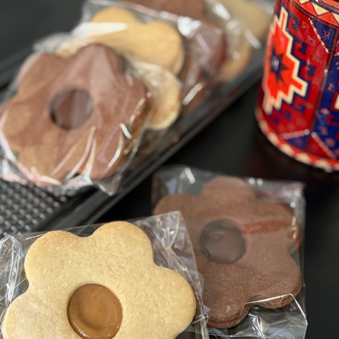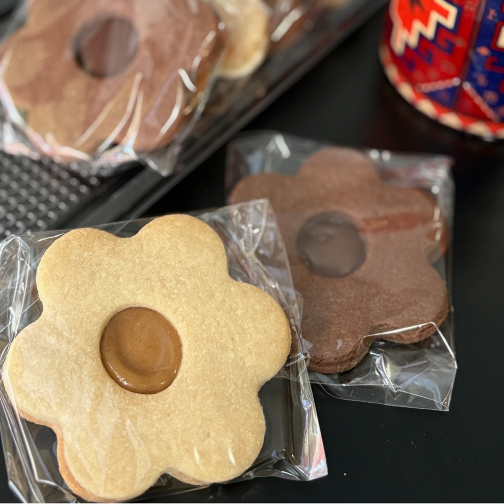 Sablé — Ingrédients: Farine, beurre végétal, sucre glace, confiture d'abricot ou chocolat, huile de tournesol, vanille, levure chimique, sel.