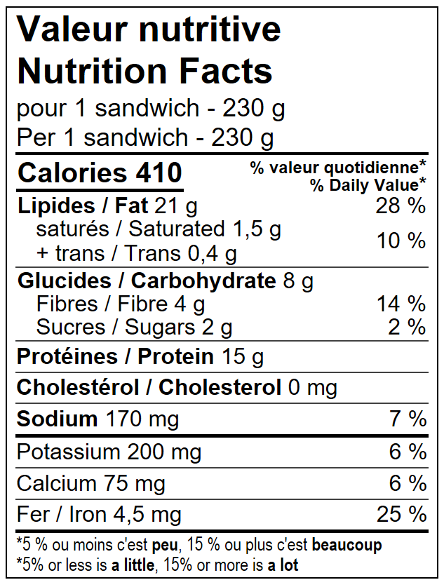 Ingrédients: Tortilla de blé sans OGM • Protéine végétale texturée (Eau, Concentré de protéine de pois*, Concentré de protéine de fève*, Sel, Épices) • Chou • Sauce à l'ail (Huile de canola, Boisson de soya non sucrée*, Ail, Vinaigre blanc) • Navets marinés (Navet, Eau, Vinaigre, Sel de mer), Carotte. *Biologique